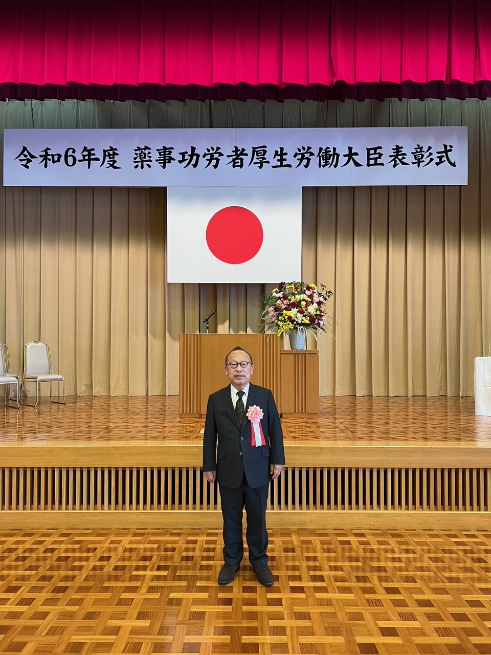この度、「令和6年度薬事功労者厚生労働大臣表彰」を受賞しましたのでお知らせいたします。 本表彰は、多年にわたり、医薬関係事業の発展向上に貢献し、医薬行政の推進に顕著な功績があった者及び団体に対して、 その功績をたたえ、その功労に報いるとともに、医薬行政の推進に寄与することを目的として、毎年、厚生労働大臣が表彰しています。 今後も地域の皆さまの健康づくりに貢献できるよう、より一層努めてまいります。